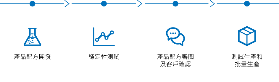 我們根據客戶的(de)具體(tǐ)要求、相(xiàng)關法規及行業(yè)标準開(kāi)發産品配方。就我們開(kāi)發的(de)每種産品配方,我們将記錄原材料添加量、産品特性及配方測試統計(jì)數據。對(duì)新産品配方進行的(de)穩定性測試包括于不同溫度及燈光(guāng)(熒光(guāng)及紫外(wài)光(guāng))下(xià)的(de)測試,以及于一段時(shí)間(jiān)內(nèi)的(de)冷(lěng)凍╱解凍測試。倘産品配方通(tōng)過所有(yǒu)相(xiàng)關測試,我們會将其提交予客戶批準,其後産品配方将于批量生(shēng)産前先進行測試生(shēng)産。